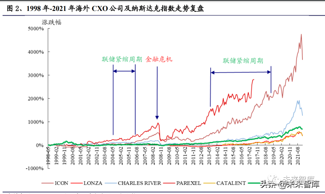 回顾 1998 年-2021 年海外部分 CXO 公司及纳斯达克指数走势,可以看到 CXO 公司和纳斯达克指数虽然在涨幅上存在较大差异,但整体走势具备相似性,历史 两轮联储紧缩周期对 CXO 公司的股价走势整体扰动较小,虽然期间存在波动, 但总体延续着上行趋势。相反 2008年金融危机对海外 CXO 公司股价造成较大负 面影响,其对金融市场及 CXO 经营业绩造成双重打击,较为显著地在反映在股 价当中。