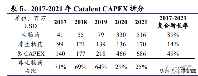 分析 CAPEX,Lonza 和 Catalent 这类头部 CDMO 公司,其 CAPEX 增长和在建 工程增长相对匹配,均处于加速增长状态,体现其对产能的加快建设。而 Recipharm 和 Siegfried 这类中型规模的海外小分子 CDMO 公司,其近年的 CAPEX 增速并不快,更趋近于全球 CDMO 市场规模的增长水平。进一步聚焦于 Lonza 和 Catalent 近年 CAPEX 的拆分,其主要的投入方向是生物药 CDMO(包 含 CGT),小分子 CDMO 占比相对较小且增速相对平稳。基于此,我们认为头 部 CDMO 企业产能建设相对较快,但主要重心不在小分子 CDMO;中型小分 子 CDMO 企业产能建设保持相对平稳增长。总体来看,海外小分子 CDMO 产 能处于稳步增长趋势。在我国小分子 CDMO 行业产能快速释放的基础下,全球 订单向中国转移和集中的趋势可持续。(报告来源:未来智库)