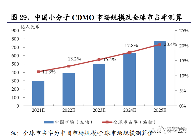 但如果从销售额角度分析,当前我国小分子 CDMO 行业占全球市场份额相对不 高。基于沙利文的全球小分子 CDMO 市场规模和中国小分子 CDMO 市场规模, 估计 2021 年中国小分子 CDMO 行业的全球市占率约为 11.3%。从全球创新药市 场规模来测算,根据沙利文数据 2021 年全球创新药市场规模为 9787 亿美元,假 设其中小分子药物占比为 70%;假设 CDMO 占比创新药销售收入的 15%;假设 当前 CDMO 的渗透率为 45%,则计算得到全球小分子 CDMO 市场规模约为 462 亿美元。对比沙利文 2021 年中国小分子 CDMO 市场规模,估计 2021 年中国小 分子 CDMO 的全球市占率约为 10.3%。
