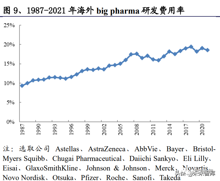 此外,除了投融资外,big pharma 的研发费用作为创新研发资金的“基本盘”, 其稳定的增长也是 CXO 维持景气度的重要驱动力。复盘历史来看,big pharma 的营收总体保持着稳定增长。虽然全球新药研发难度处于持续提升状态,但研发 费用率总体保持稳步上行趋势。从研发费用角度来看,2013 年后 big pharma 研 发费用重新回归增长趋势。