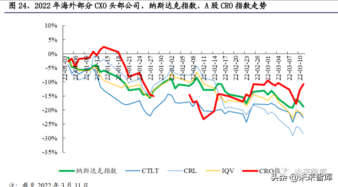 这一轮上行周期结束时点基本在 2021Q3 末左右,此后海外 CXO 板块和国内 CXO 板块纷纷进入下行周期。分析来看,我们认为海外和国内 CXO 板块的下行 在逻辑上存在一定的差异。海外头部 CXO 公司股价的下行,我们认为一方面源 于疫情进入复苏阶段后部分公司业绩增速开始有所回落(季度业绩数据变化);另一方面,流动性收紧悲观预期、全球地缘政治局势变化等因素影响纳斯达克指 数,纳斯达克指数整体趋势向下。反观国内 CXO 板块,其下行主要源于行业因素 和板块估值等因素,业绩、订单等经营层面数据仍保持较好的增长趋势。