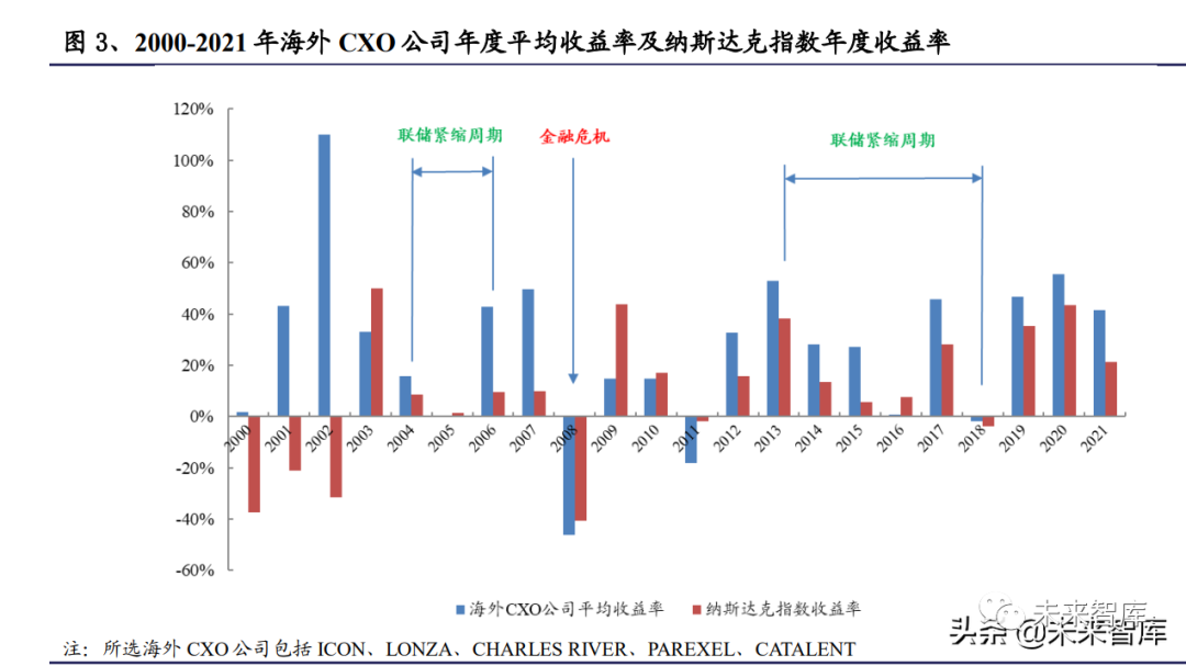 具体分析 2000年以来每一年的收益率也能进一步体现这一点,可以看到在联储 紧缩期间多数年份海外 CXO 公司的平均收益率是显著超过纳斯达克指数的,而 在 2008年金融危机及之后 3 年海外 CXO 公司的收益率不及纳斯达克指数。