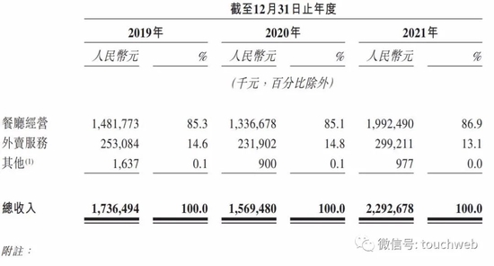 绿茶餐厅在2021年的收入中,19.92亿元来自餐饮经营,占比为86.9%;来自外卖收入为2.99亿元,占比为13.1%。