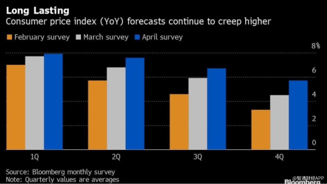 根据受调查的72位经济学家的预测中值,今年第四季度,消费者价格指数升幅均值料为5.7%,高于他们一个月前预测的4.5%。明年出现衰退的可能性也从3月份的20%上升到27.5%。3月份的CPI报告将在下周二发布。