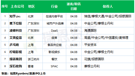 这8家递表企业中,除了来自香港的深石收购外,其他的7家都来自内地:包括知乎(来自北京)、蕉下控股(来自广东深圳)、凌雄科技(来自广东深圳)、艾美疫苗(来自北京)、乒乓响(来自上海)、柠萌影视(来自上海)、绿茶集团(来自浙江杭州)。