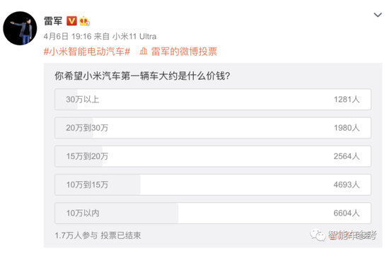 不过在微博投票中,广大人民群众对小米汽车的期待还是实惠的性价比产品: