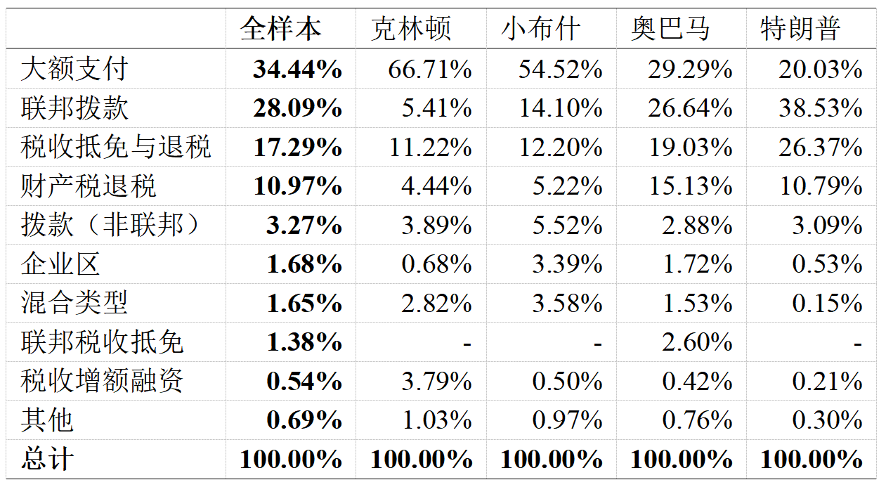 总体来看,无论是从政府补贴规模还是从政府补贴频率来看,民主党总统任期内的产业补贴政策常采用税收优惠的形式,而共和党总统任期内的产业补贴政策常采用拨款与联邦拨款的形式。我们进一步分析历任总统任期内的政府补贴偏向,可以发现,克林顿任期内的补贴政策偏向是大额支付和税收增额融资,小布什任期内的补贴政策偏向是拨款和企业区,奥巴马任期内的补贴政策偏向是财产税减免和联邦税收抵免,特朗普任期内的补贴政策偏向是联邦拨款和税收抵免与退税。