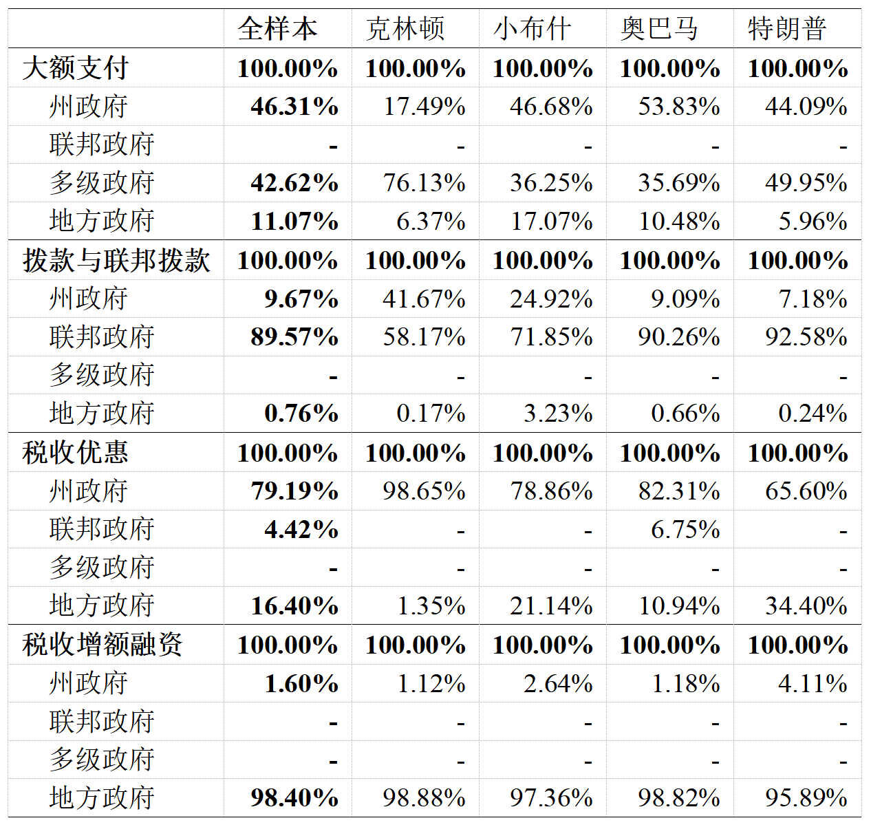 就美国产业补贴资金的来源结构而言,州政府是最主要的补贴政策实施主体,约占全国产业补贴总额的45%;联邦政府次之,约占全国产业补贴总额的29%;地方政府位列最末,约占全国产业补贴总额的11%;另外还有一些补贴由多级政府共同发放,约占全国产业补贴总额的15%。从各总统任期内补贴资金来源变化来看,大额支付政策的实施主体主要为州政府, 并且逐渐从地方政府转向州政府,或由地方政府与州政府共担;拨款与联邦拨款政策的实施主体主要为联邦政府,并且逐渐从州和地方政府转向联邦政府;税收优惠政策的实施主体主要为州政府,但在共和党总统任期内转向地方政府;税收增额融资政策的实施主体主要为地方政府,但在共和党总统任期内转向州政府。