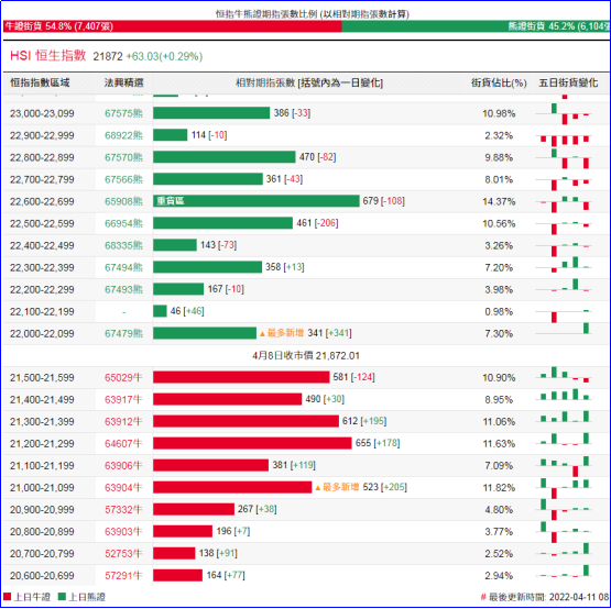 街货分布方面,至上周五,恒指牛证街货主要在收回价21000点至21600点之间,累计相当约3242张期指合约;恒指熊证街货在收回价22000点至22900点之间,累计相当约3026张期指合约。