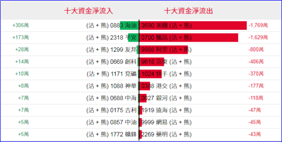 淡仓(认沽证及熊证)方面,上周五中海油、中国平安等相关淡仓录部分资金净流入;美团、腾讯控股、阿里巴巴等相关淡仓则分别约1769万、1629万及800万港元资金净流出套现。