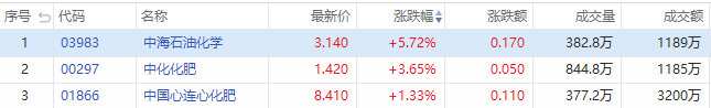 华盛资讯4月11日讯,港股化肥股逆市上涨,截至发稿,中海石油化学涨近6%,心连心化肥涨超3%,中化化肥涨超1%。