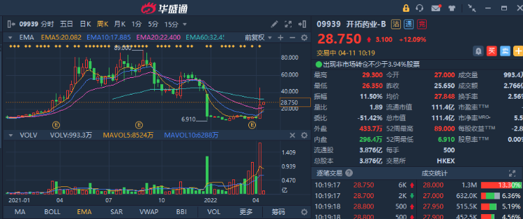 华盛资讯4月11日讯,开拓药业-B(09939)早盘再涨超12%,近五日累涨超170%。