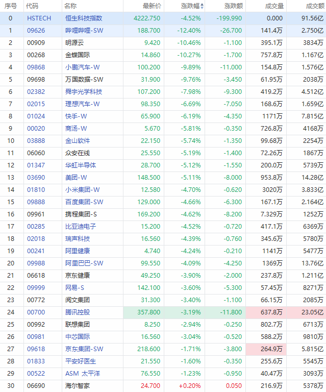 成分股中,哔哩哔哩跌12.4%领跌,现报188.7港元每股;明源云、金蝶国际跌超10%。