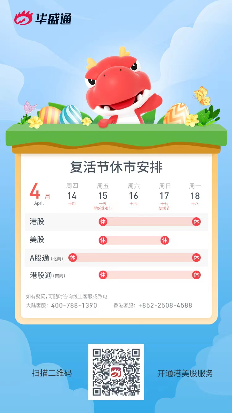 港股:4月15日(星期五)因耶稣受难日休市,4月18日(星期一)因复活节休市,沪、深交易所不提供港股通服务。4月19日(星期二)正常开市。