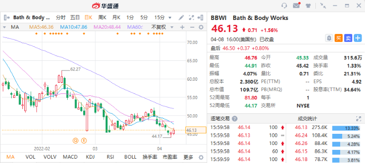 尽管业绩显示出较强的优势,但跟随大盘走势,Bath & Body Works较去年11月股价峰值已经回调39.63%。
