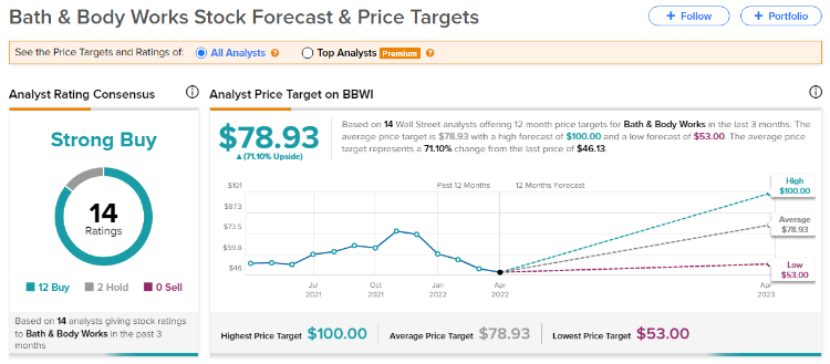 Siegel对Bath & Body Works给出“跑赢大盘”评级,目标价83美元,显示出未来12个月的股价增长空间为80%。