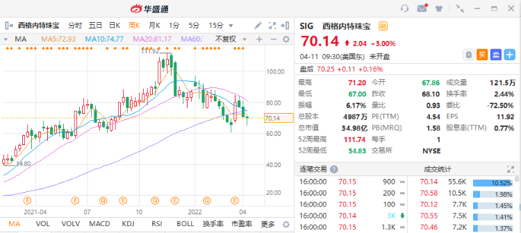 尽管同样受环境因素影响,Signet已从去年11月的股价高点回调37.3%,近期Signet更是表示将不再从世界上最大的宝石产地,俄罗斯,购买宝石。