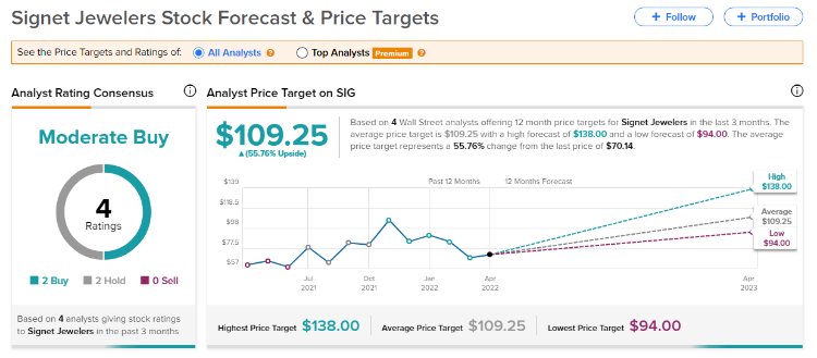 Boruchow对SIG给出“跑赢大盘”评级,目标价为105美元。TipRanks上,华尔街分析师给出了2个“买入”和2个“卖出”评级,平均目标价为109.25美元,意味着从目前的水平有约56%的上升空间。