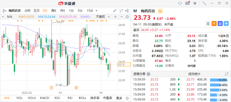 业绩预期方面,梅西百货预计2022年收入和每股收益分别为244.6-247亿美元和4.13-4.52美元,仅以中间值计算,将分别超出市场预期2%和7%。