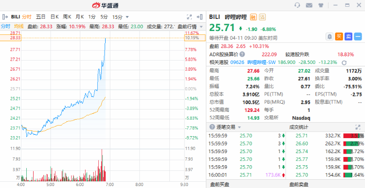 华盛资讯4月11日消息,哔哩哔哩(BILI)盘前走高,涨超10%,此前一度跌超9%;网易(NTES)盘前走高,涨近9%。消息面上,有市场传闻称游戏版号即将恢复下发。