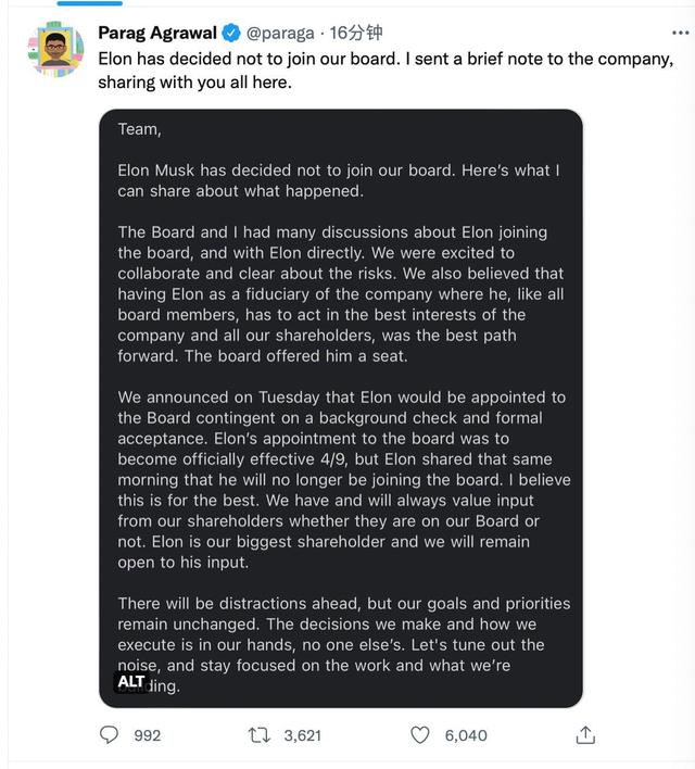 推特 $TWTR CEO:马斯克决定不加入公司董事会