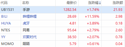 华盛资讯4月11日,中概游戏概念股普涨,哔哩哔哩 $BILI 涨超11%,虎牙 $HUYA 涨超3%,网易 $NTES 涨超2%。此前国家新闻出版署公布2022年4月份国产网络游戏审批信息,共45款游戏。经历了263天的焦灼等待,游戏版号终于重新下发了。