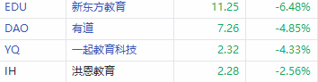 中概教育股跌幅也有所收窄,新东方 $EDU 跌超6%,有道 $DAO 跌超4%,高途 $GOTU 跌超2%。