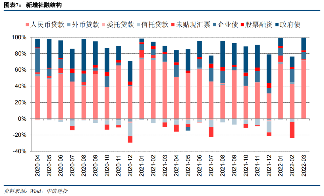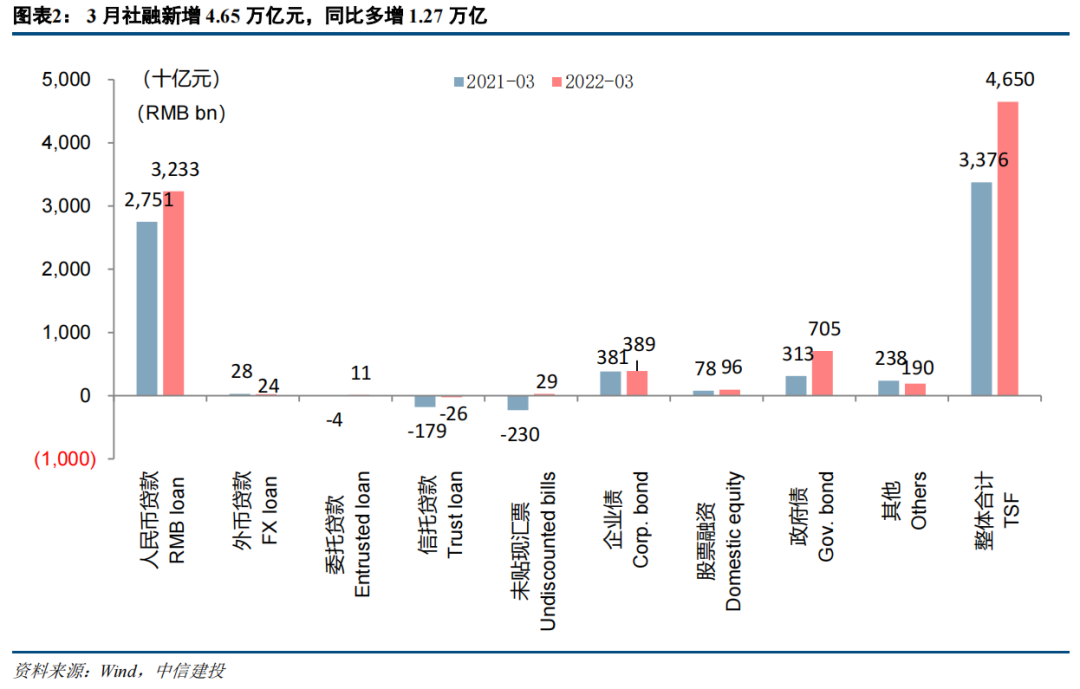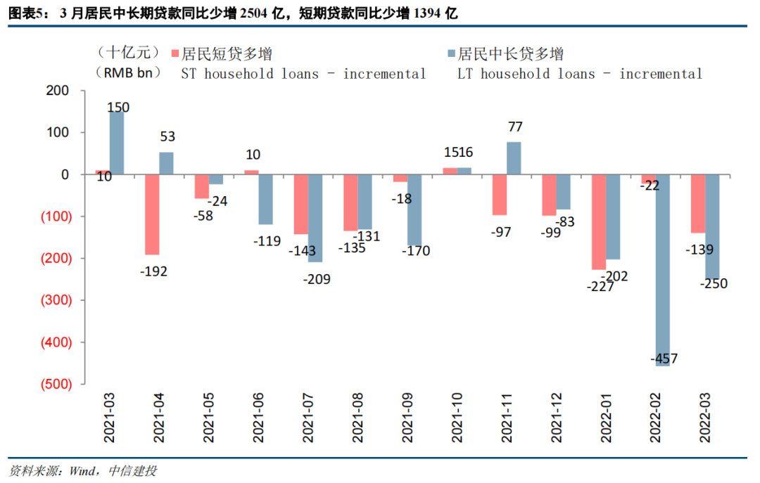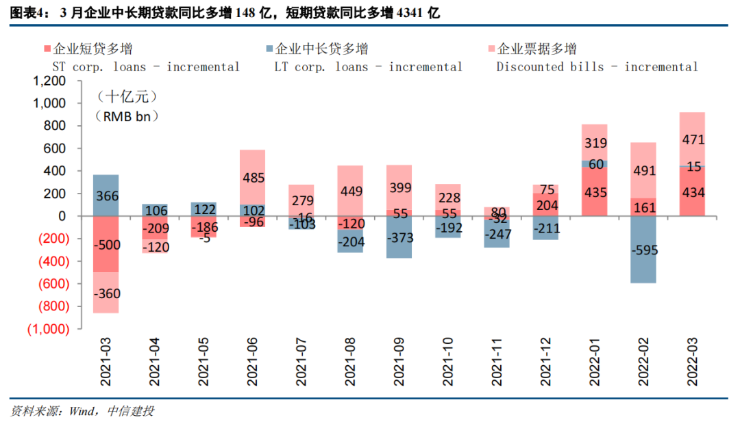 2、企业贷款在稳增长基建投放下保持高位投放,零售贷款受疫情和地产影响同比少增。3月信贷新增3.13万亿,同比多0.40万亿,其中企业贷款(含票据)新增2.47万亿,同比多增0.92万亿;零售贷款新增0.76万亿,同比少增0.39万亿。