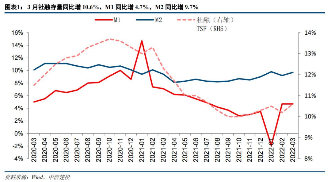 事件:4月11日,央行发布2022年3月金融数据。其中,3月社融新增4.65万亿,同比多增1.27万亿,存量社融增速10.6%,环比上升0.4pct。3月人民币贷款新增3.13万亿,同比多增0.40万亿。M1增速4.7%,环比持平,M2增速9.7%,环比上升0.5pct。