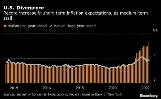 根据纽约联储周一发布的3月份消费者调查,一年通胀预期中值从一个月前的6%升至6.6%。三年通胀预期则从6个月前的4.2%降至3.7%。