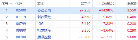 其他游戏股方面,创梦天地涨近10%,IGG涨超7%,祖龙娱乐涨近4%,腾讯涨超2%。