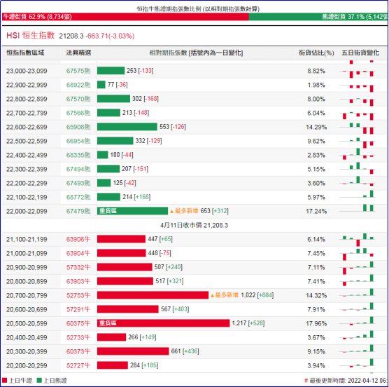 街货分布方面,至周一,恒指牛证街货主要在收回价20500点至21200点之间,累计相当约4725张期指合约;恒指熊证街货相对分散,主要在收回价22000点至22900点之间,累计相当约2699张期指合约。
