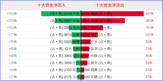 淡仓(认沽证及熊证)方面,周一中国平安、中国石油、中国海洋石油等相关淡仓录资金净流入部署;腾讯控股、美团、银河娱乐等相关淡仓则分别约547万、383万及191万港元资金净流出套现。