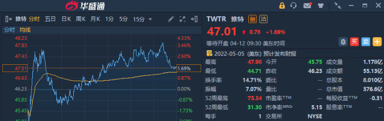 截至美股4月11日收盘,推特(TWTR.US)涨1.69%,报47.01美元/股。