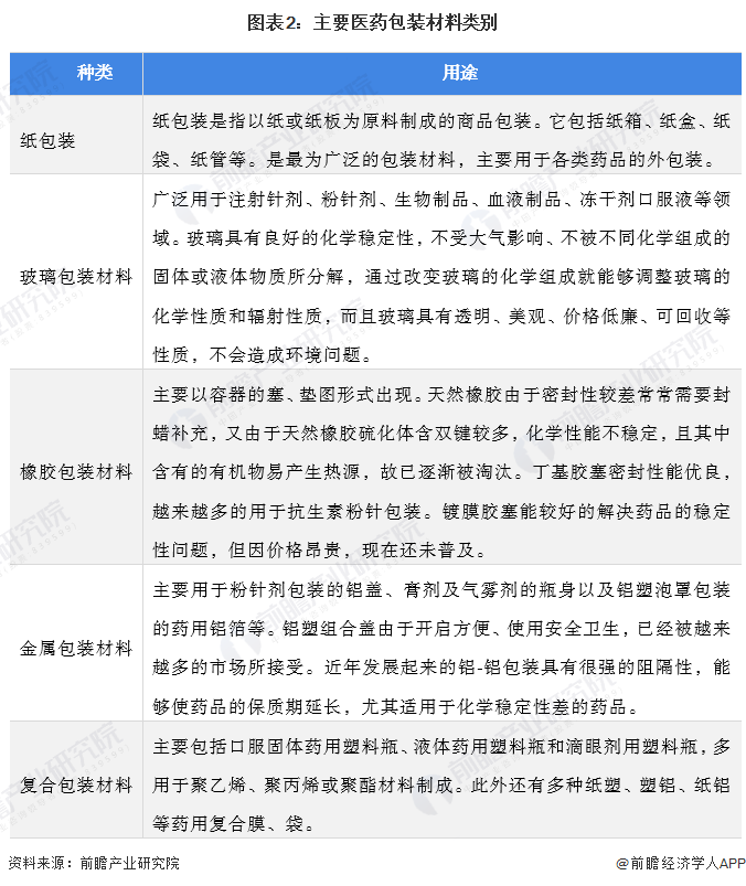 从材料种类来看,药用包装主要有纸包装、玻璃包装、橡胶包装、金属包装及塑料包装等几类,目前一些新型复合材料也正不断被引入这一领域。