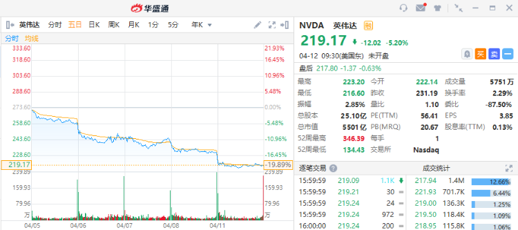 周一,英伟达 $NVDA 低开低走,盘中一度跌近7%,截至收盘,该股跌5.25%。近5个交易日,英伟达累计下跌近20%,年内累跌25.47%。就在周一美股盘前,投行Baird将英伟达评级从“跑赢大盘”下调至“中性”,并将其目标价从360美元下调至225美元。