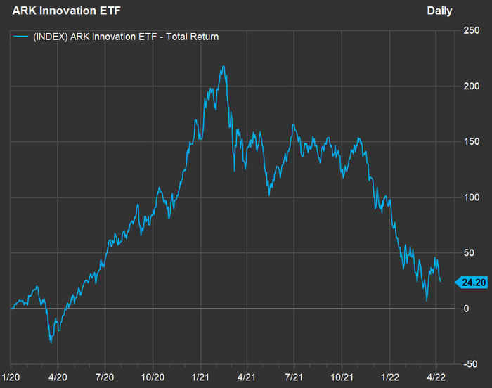 而在近一两年的时间,这些股无疑都是市场上的宠儿。以木头姐为代表,兴起了一种投资颠覆性创新公司的风格,并获得不错的回报。而在当下,下图显示了木头姐旗下创新旗舰的ETF ARKK $ARKK 自2019年以来的总回报,几乎已经快要回到2020年初,而此前木头姐还表示,她所看好的股票已经跌入“深度价值领域”,她的策略“在未来五年内可实现30%-40%的复合年回报率”: