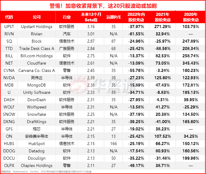 philip van doorn认为,接下来对于英伟达等高市值的科技公司来说,可能仍然是艰难的,投资者可以避开或是进行反向交易。这里分析师整理了罗素1000指数中,市值超过100亿美元的20家未来波动性或较高(以风险指数贝塔值来衡量)的公司,理论上来说当贝塔值β>1时,表示该股票收益和风险均大于大盘指数的收益和风险: