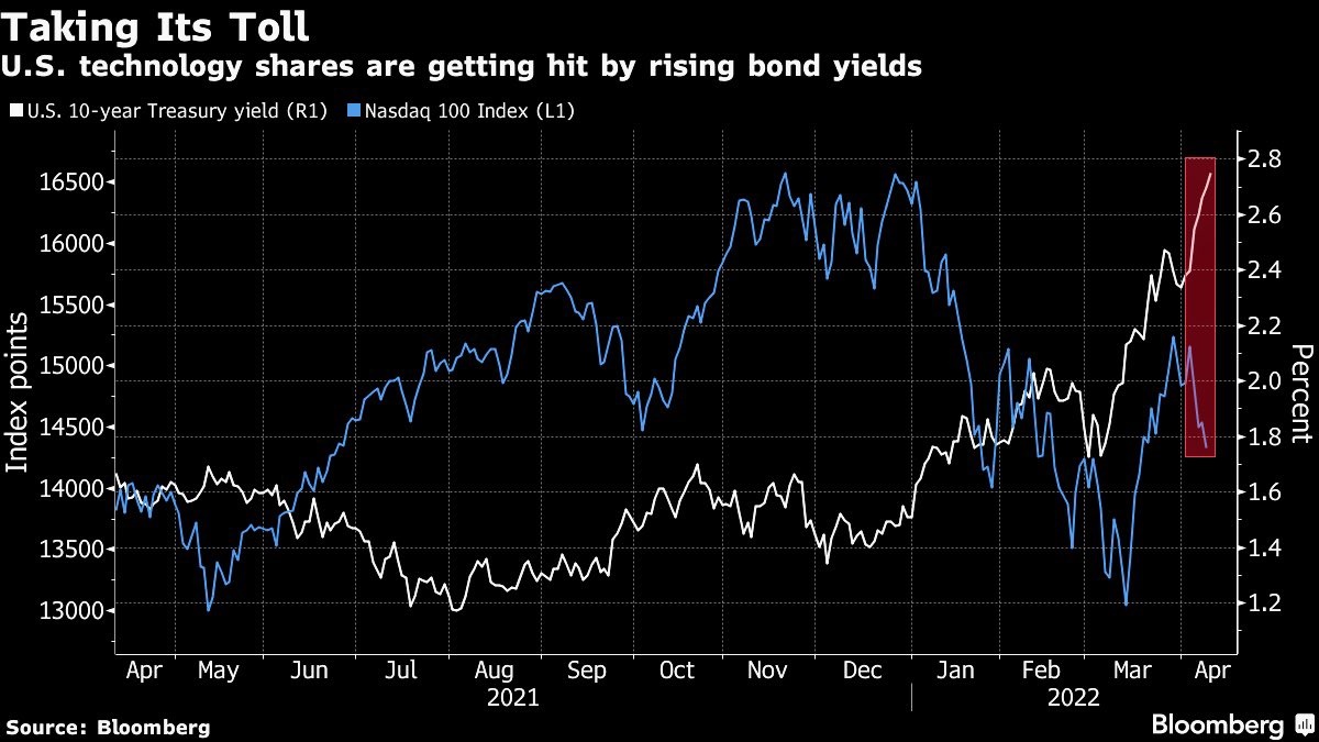 周一,Welt的Holger Zschaepitz在推特上指出,4月份,美国科技股和债券收益率之间的走势出现了明显的背离。他表示,美国科技股(纳斯达克100指数),美国科技股感受到了收益率上升的热度。美国10年期收益率在周一上午跃升到了2.78%水平,为2019年(1月)以来最高水平。