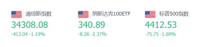 截至周一收盘, 道指跌1.19%,报34308.08点,标普500指数跌1.69%,报4412.53点,纳指跌2.18%,报13411.96点。