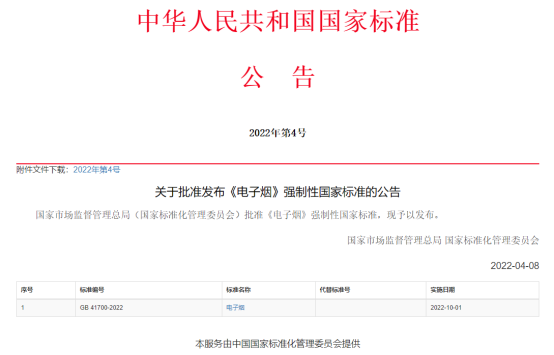 雾芯科技盘前一度涨超30%,消息面上,国家市场监督管理总局(国家标准化管理委员会)批准《电子烟》强制性国家标准,现予以发布,自2022年10月1日起实施。