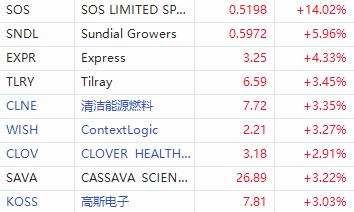 美股WSB概念股普涨,SOS涨超14%,Express涨超4%,Robinhood、高斯电子涨超3%。
