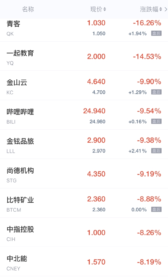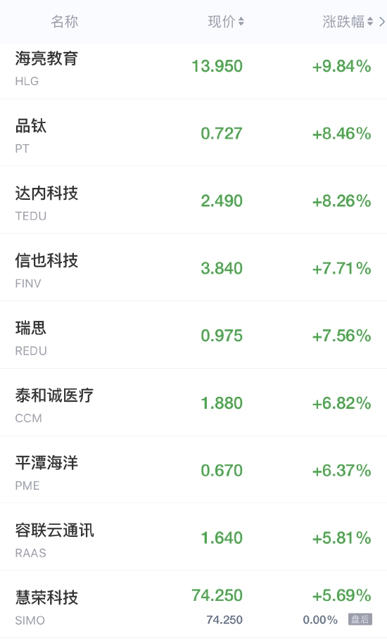瑞思涨超7%,新东方、达达集团、中网载线涨超3%,携程涨近3%,欢聚集团、怪兽充电、名创优品、猎豹移动涨超2%,雾芯科技、新氧、高途、迅雷涨超1%。