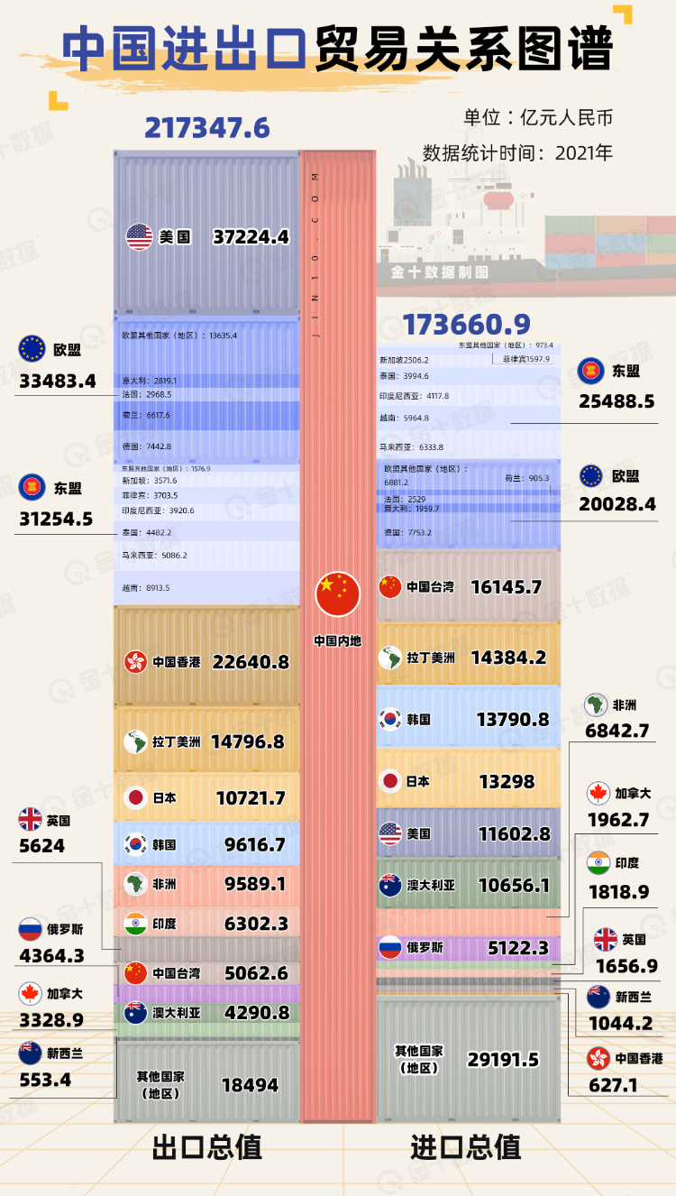 2022年一季度,我国外贸结构持续优化,一般贸易进出口5.95万亿元,同比增长13.9%。我国对东盟、欧盟、美国、韩国分别进出口1.35万亿元、1.31万亿元、1.18万亿元、5741.8亿元,同比分别增长8.4%、10.2%、9.9%和12.3%。东盟继续为我国第一大贸易伙伴,占我国外贸总值的14.4%。