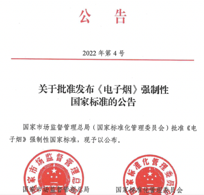 4月12日晚,国家市场监督管理总局批准《电子烟》强制性国家标准,自2022年10月1日起实施。