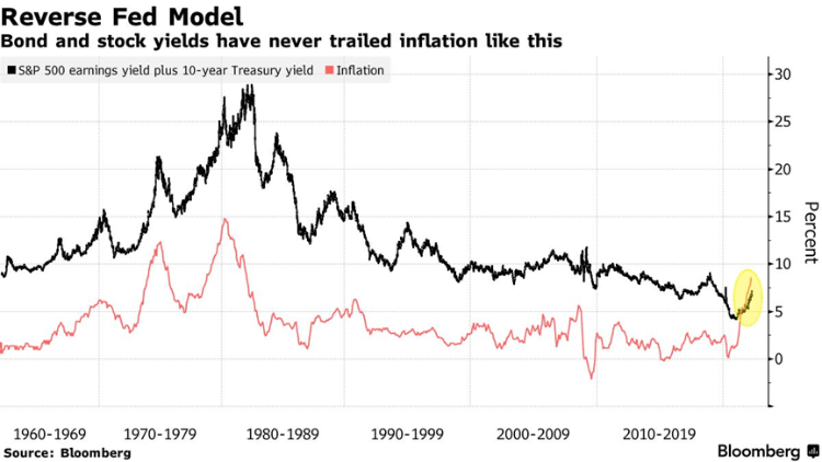 Jones strading在一份报告中提出了一种衡量股债估值泡沫的新方法,该报告将标普500指数的收益率和10年期美债的利率相加得出总收益率——这被称为“反向美联储模型(reverse Fed model)” 。总的来说,即使债券利率有所上升,目前的总收益率仍为7.2%,该比率低于自1962年以来93%的时间。