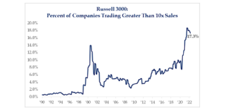 此外,从其他指标来看,股票目前也很贵。根据Strategas Securities编制的数据,罗素3000指数成分股中,约有17%的成分股市盈率在10倍以上,这一比例甚至超过了互联网泡沫时代。