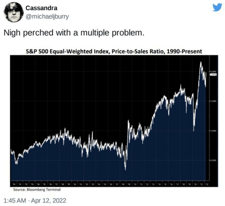 伯里在推特上写道:“这几乎是一个多重问题。”他还附上了一张跟踪标普500等权重指数市盈率的图表。图表显示,在上世纪90年代和本世纪头十年的大部分时间里,这一比率低于1.0,但在过去10年里,这一比率几乎翻了一番,如今已超过1.9。
