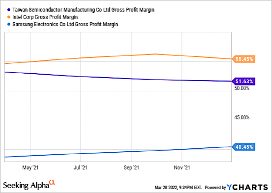 图 2 显示了 TSM、SSNLF 和 INTC 的毛利率。请记住,TSM 的价值是针对其整个业务的,它是一家纯粹的代工厂。英特尔的 GPM 目前针对其内部业务,因为其代工业务处于起步阶段。SSNLF 的 GPM 是针对整体业务的,但该业务不仅是代工,还包括内存、显示器、智能手机和消费产品。