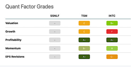 图 3 显示了这三家公司的各种评级。TSM 对 INTC 的量化评级为强烈买入与持有。